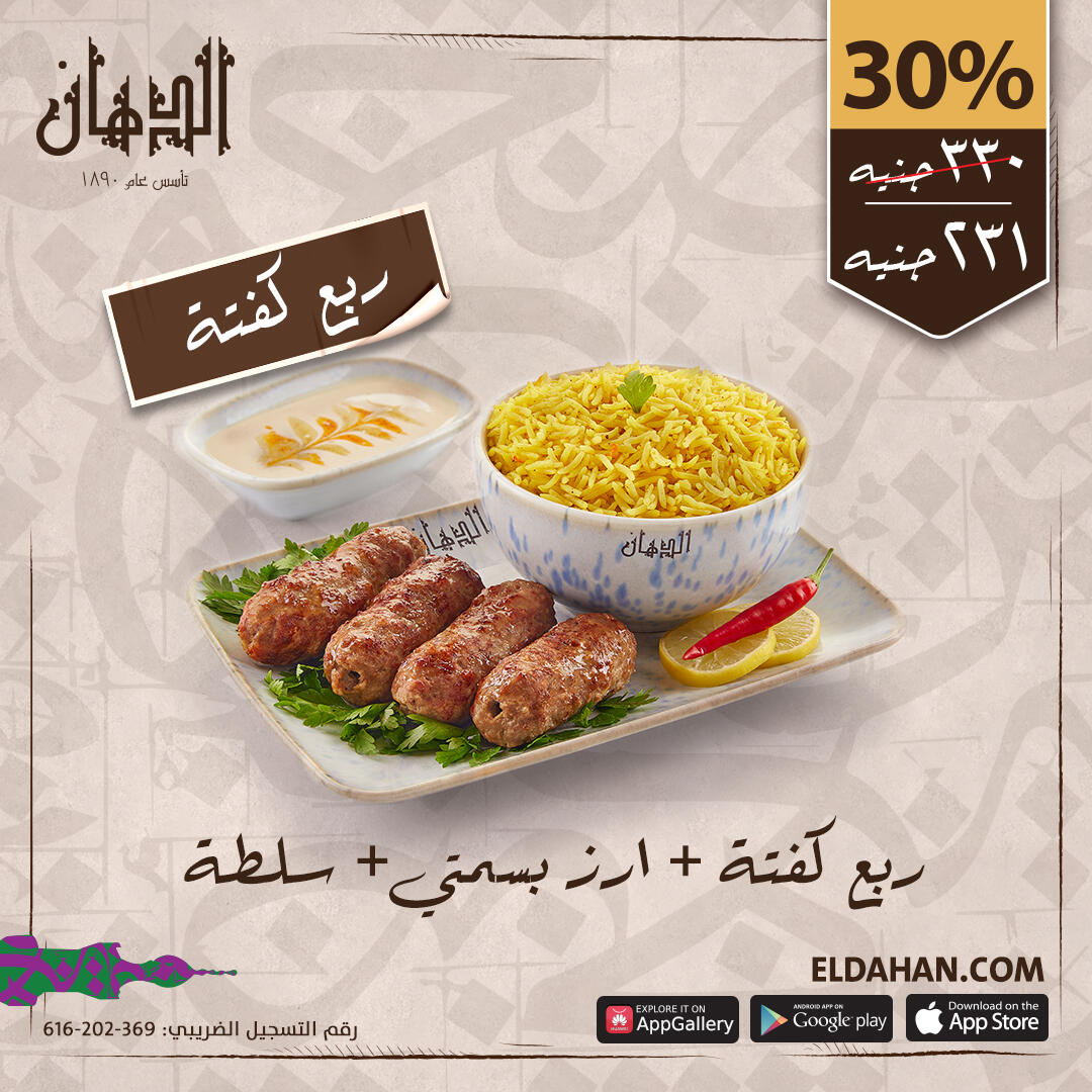 أشهر أطباق الدهان تقدم الكفته المشويه المصنوعه من أجود انواع اللحوم بخلطته السريه مع أختيارك من السلطات وعيش الدهان الساخن